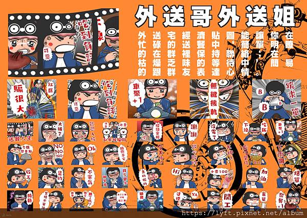 [外送哥外送姐]外送經濟人口近年飆升,外送員是辛苦的!風吹日曬雨淋,偶爾顧路時也要在群裡哈拉一下,Line 貼圖中少有針對送餐員的需要設計貼圖,這款貼圖裡是統計台北、桃園、新竹、台中、嘉義、台南、高雄的送餐員,Line 群中最常用的對話用語前40名,讓您能在騎摩托車的時後,能迅速的與人聯絡,是一款送禮或自用的好貼圖,家人或好友有在送餐的,別忘了買來送他(她),貼心的小禮物,讓家人朋友間更深的情感交流。